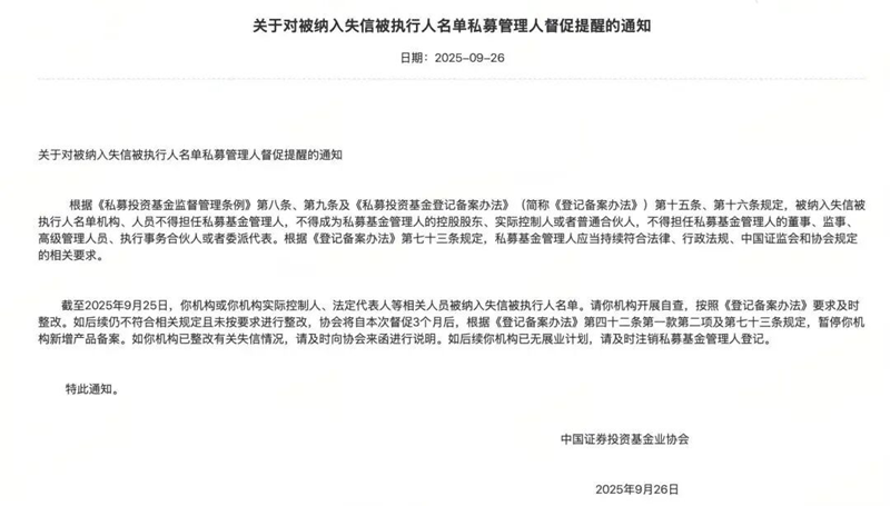 近日,部分私募管理人收到中基协发送的《关于对被纳入失信被执行人名单私募管理人督促提醒的通知》。