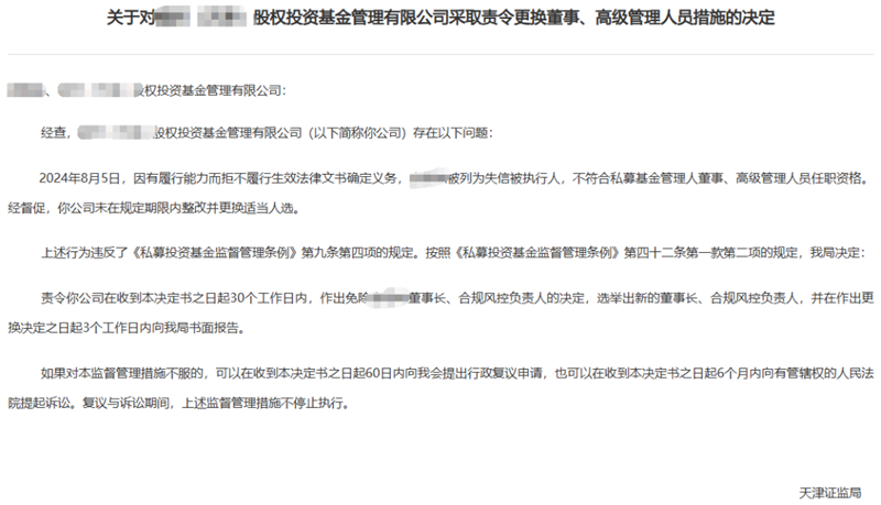 根据证监局的处罚决定书,2024年8月5日,因有履行能力而拒不履行生效法律文书确定义务,天津某私募的实控人唐某被列为失信被执行人,不符合私募基金管理人董事、高级管理人员任职资格。经督促,管理人未在规定期限内整改并更换适当人选。