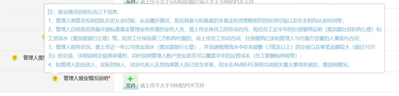 在该通知中,协会请管理人在提交新基金备案时一并提供展业情况说明材料,与此次Ambers系统中新增的“管理人展业情况说明”要求一致。因此,“管理人展业情况说明”的相关材料应该是针对当时收到通知的管理人,如果之前收到了通知,建议提交新基金备案之前提前准备好展业情况说明的相关材料,一并提交。