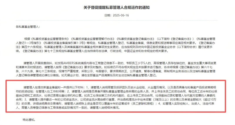 据了解,并不是所有管理人在基金备案时都需要提交以上信息。今年6月份,中基协曾经向一部分私募管理人发送了《关于督促提醒私募管理人合规运作的通知》,如下图所示: