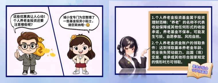 该漫画以长城基金投教小使者“城小宝”与“财哥宝妹”的互动为主线,系统介绍了个人养老金账户的优势:通过该账户购买养老FOF基金Y类份额,可享受“双重优惠”,包括基金费率优惠和税收递延政策。同时,漫画还提示了投资风险与账户领取条件,内容全面、形式活泼,有效帮助投资者直观理解个人养老金政策。